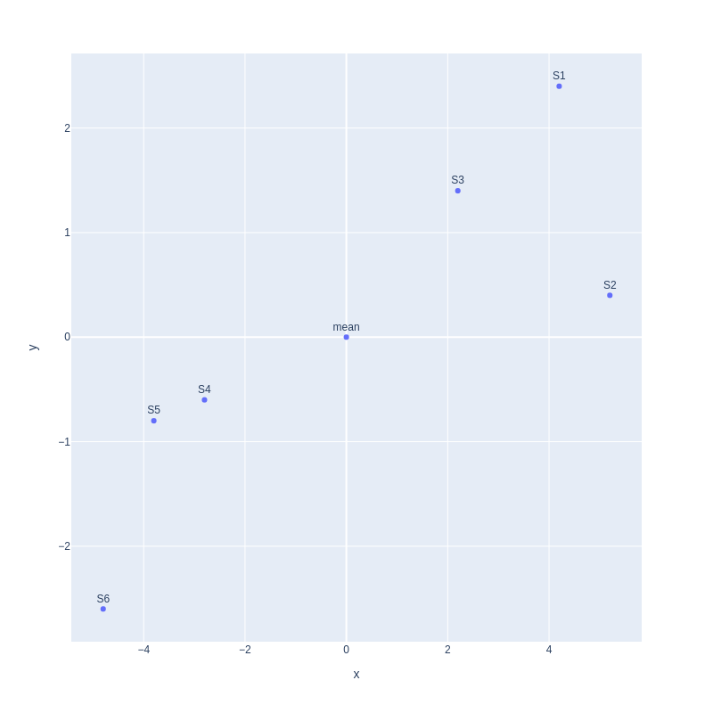 As can be seen in the graph, there are two clusters of samples, one on the left with samples (S6,S5,S4) and the other on the right with samples (S3,S1,S2). Now, let’s plot our data using two variables of v1 and v2.